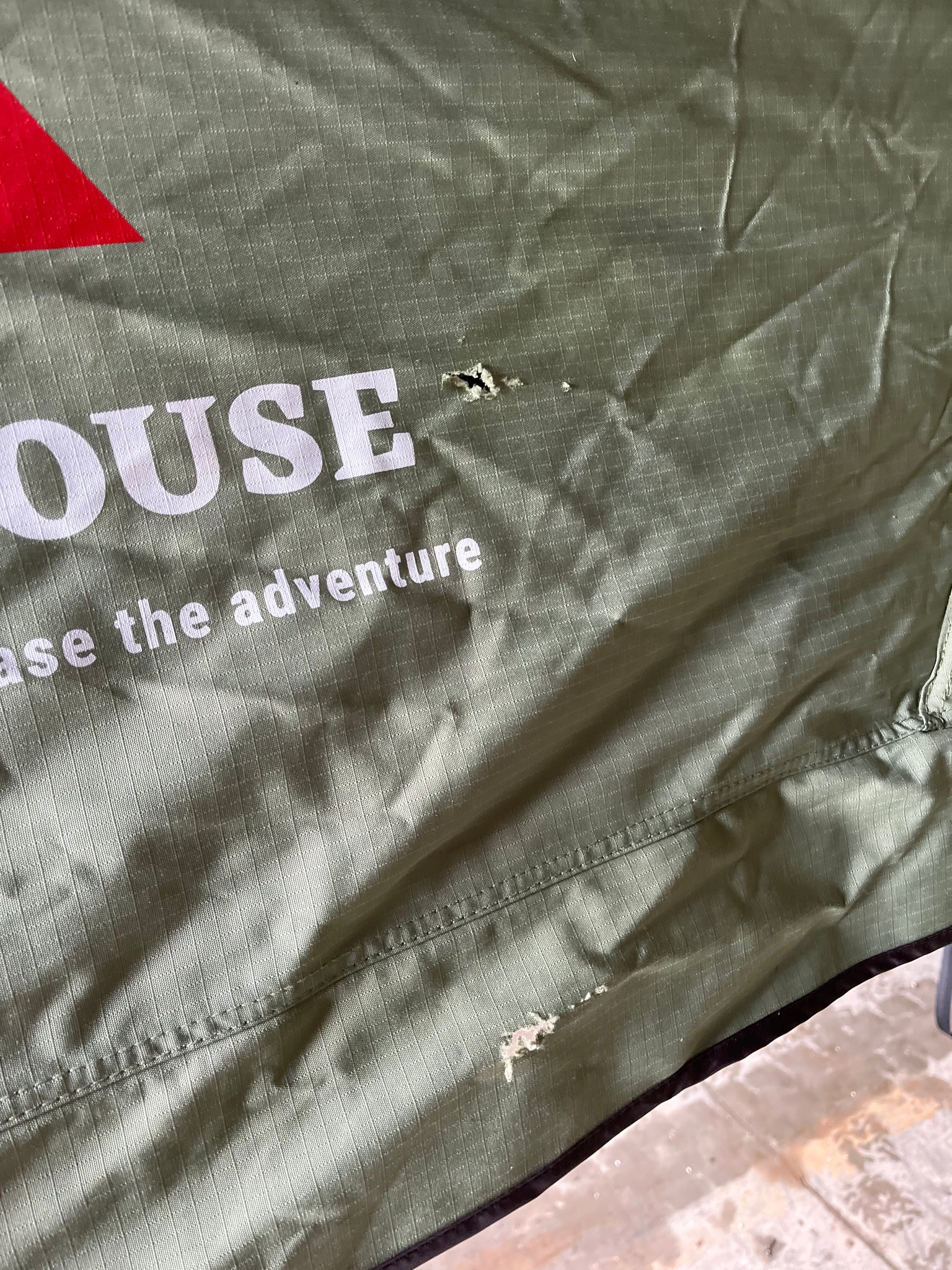 THE GREEN TENT HAD A LITTLE FRIEND CHEW IT IN A FEW SPOTS- OTHER THAN THAT IT IS BRAND NEW, COMES WITH A DOUBLE ANNEX THAT WAS USED TWICE.